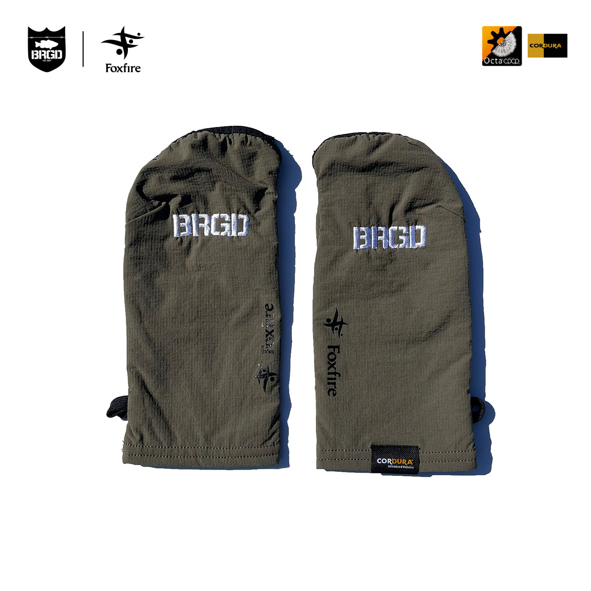 A hand warmer built with a durable, water-repellent CORDURA® outer shell and lined with Octa® CPCP, a high-performance tricot material engineered with a hollow, eight-segment fiber structure that traps ample dead air for exceptional warmth and breathability. An embroidered BRGD logo is placed on the back of the hand.